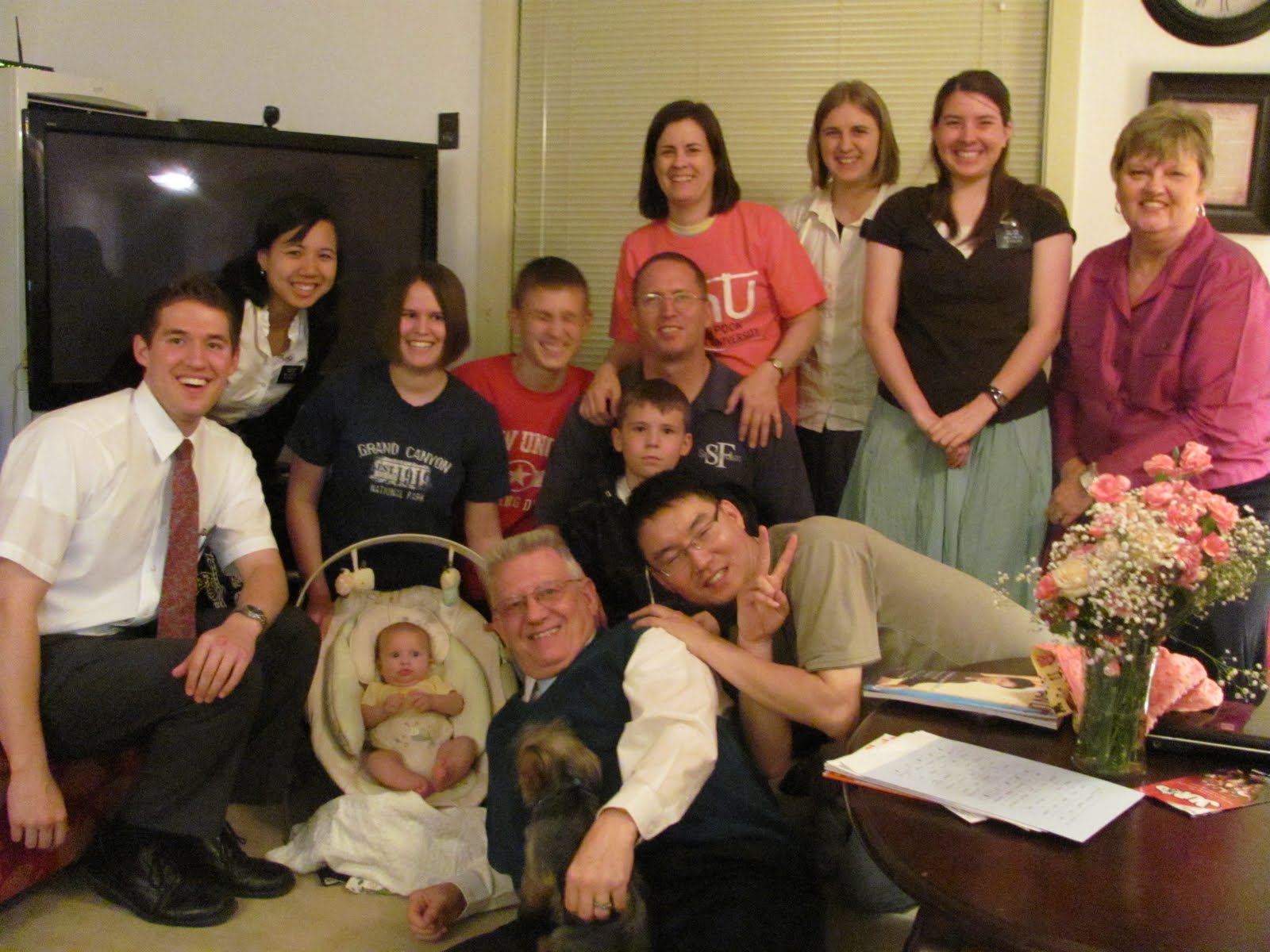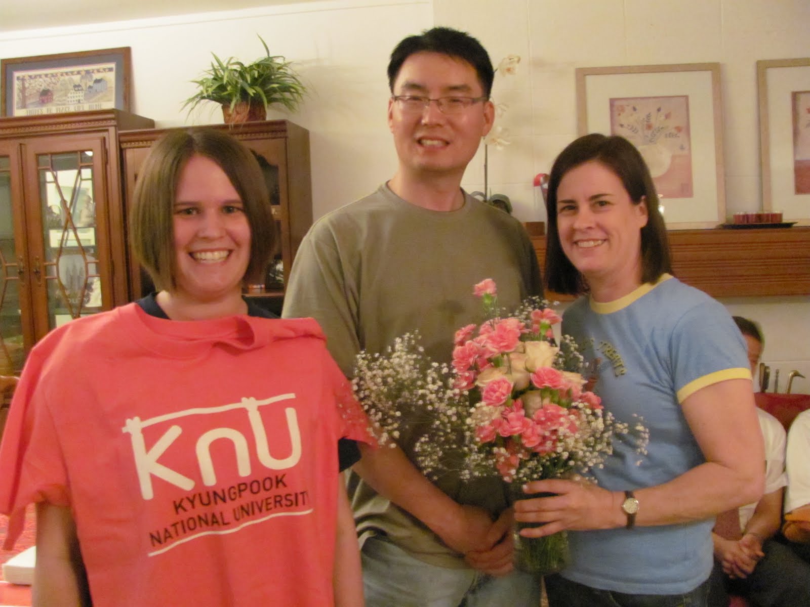 It was getting close to Brittney Burnett and baby Amber leaving for the states. Sister Burnett had a large group of missionaries over for dinner along with our fairly-new convert, Bro. Eems for a farewell dinner for them. Brother Eems brought Brittney a T-shirt from one of the universities in Daegu and some beautiful flowers for CJ.
