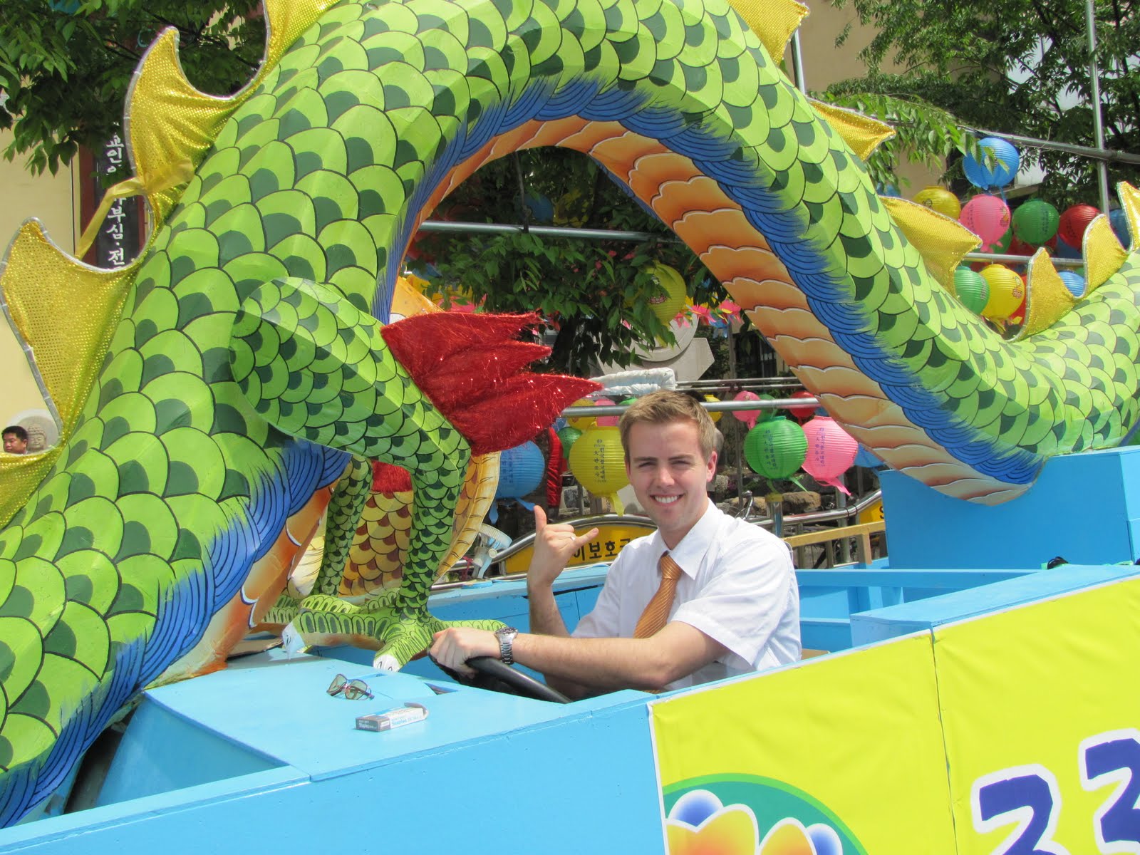 Elder Wade is standing next to a float carrying a dragon that will be a part of one of the parades. They will cover the vehicle when they are ready to move.