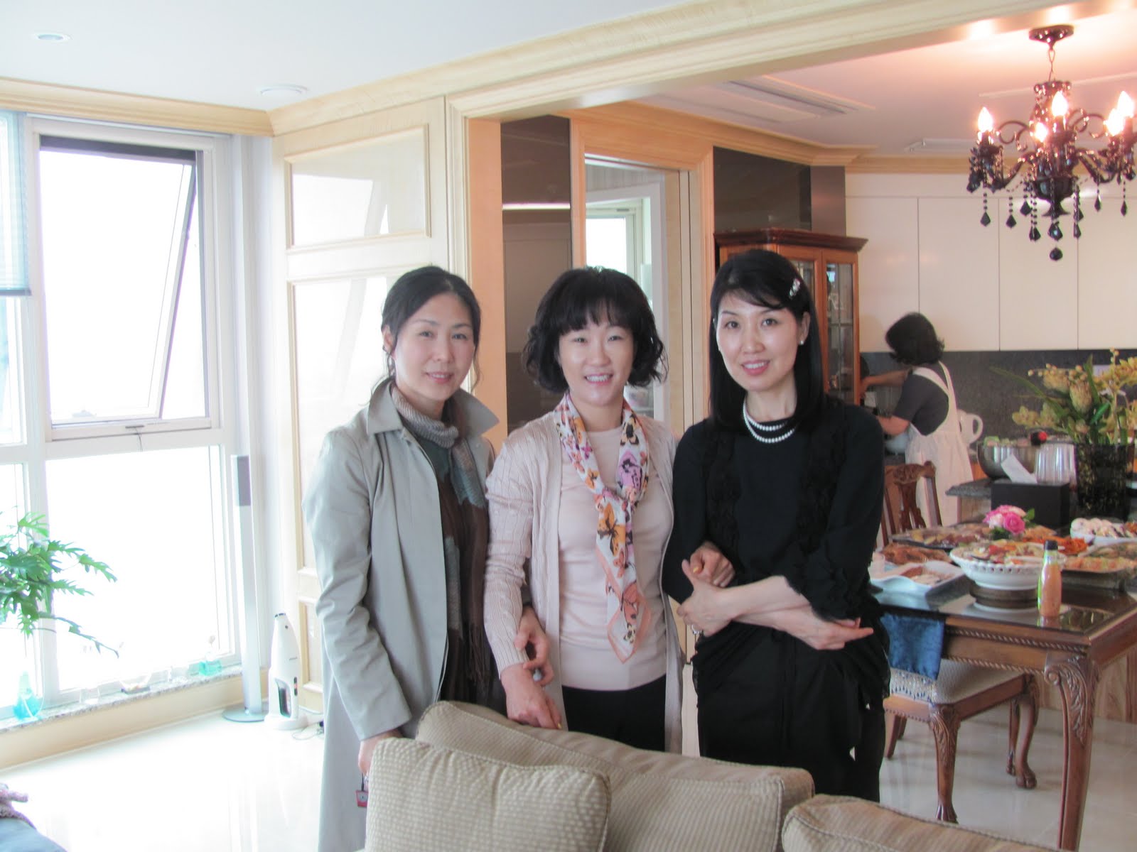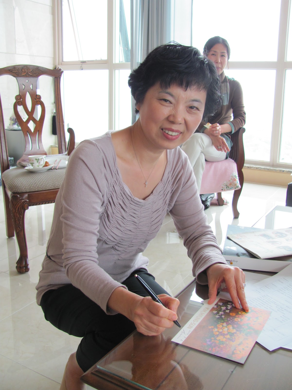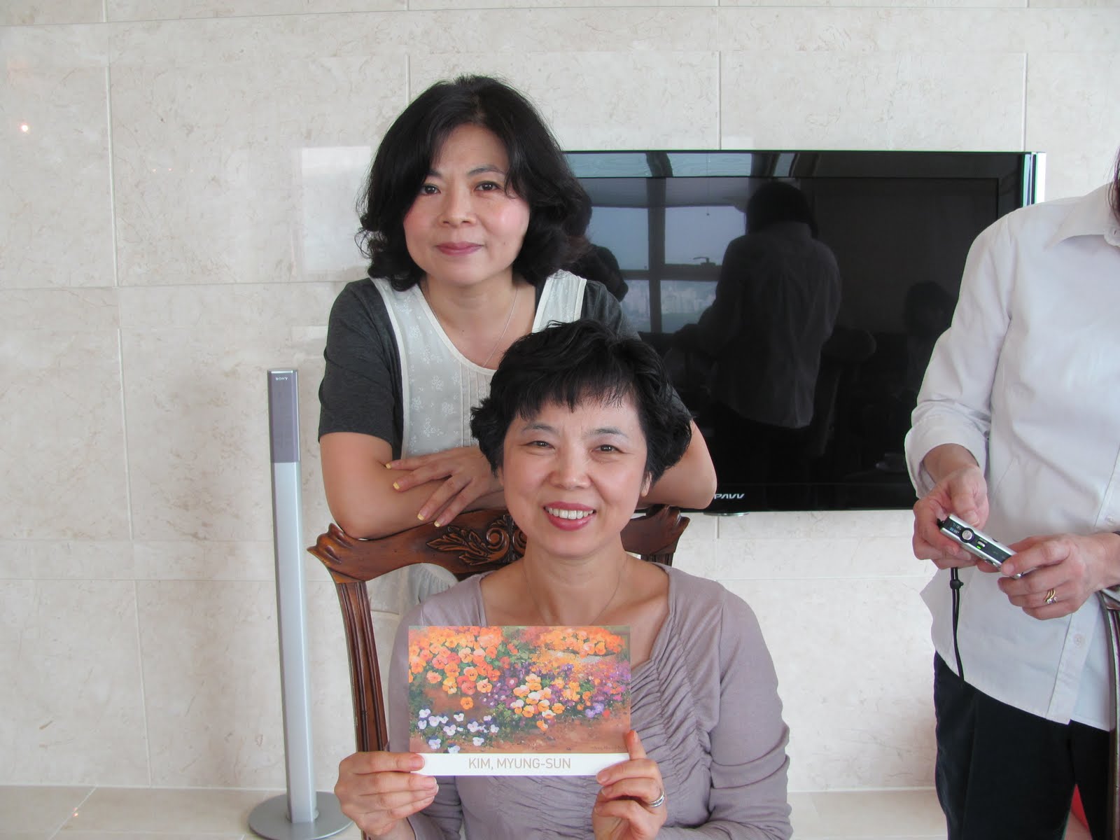 The pretty lady standing is the owner of the apartment, and our hostess. The lady sitting is Kim, Myung-Sun. She is an artist and is holding an invitation to her Grand Opening of her work at a local art gallery in Daegu. She truly paints beautiful pictures, mostly flowers and arrangements.