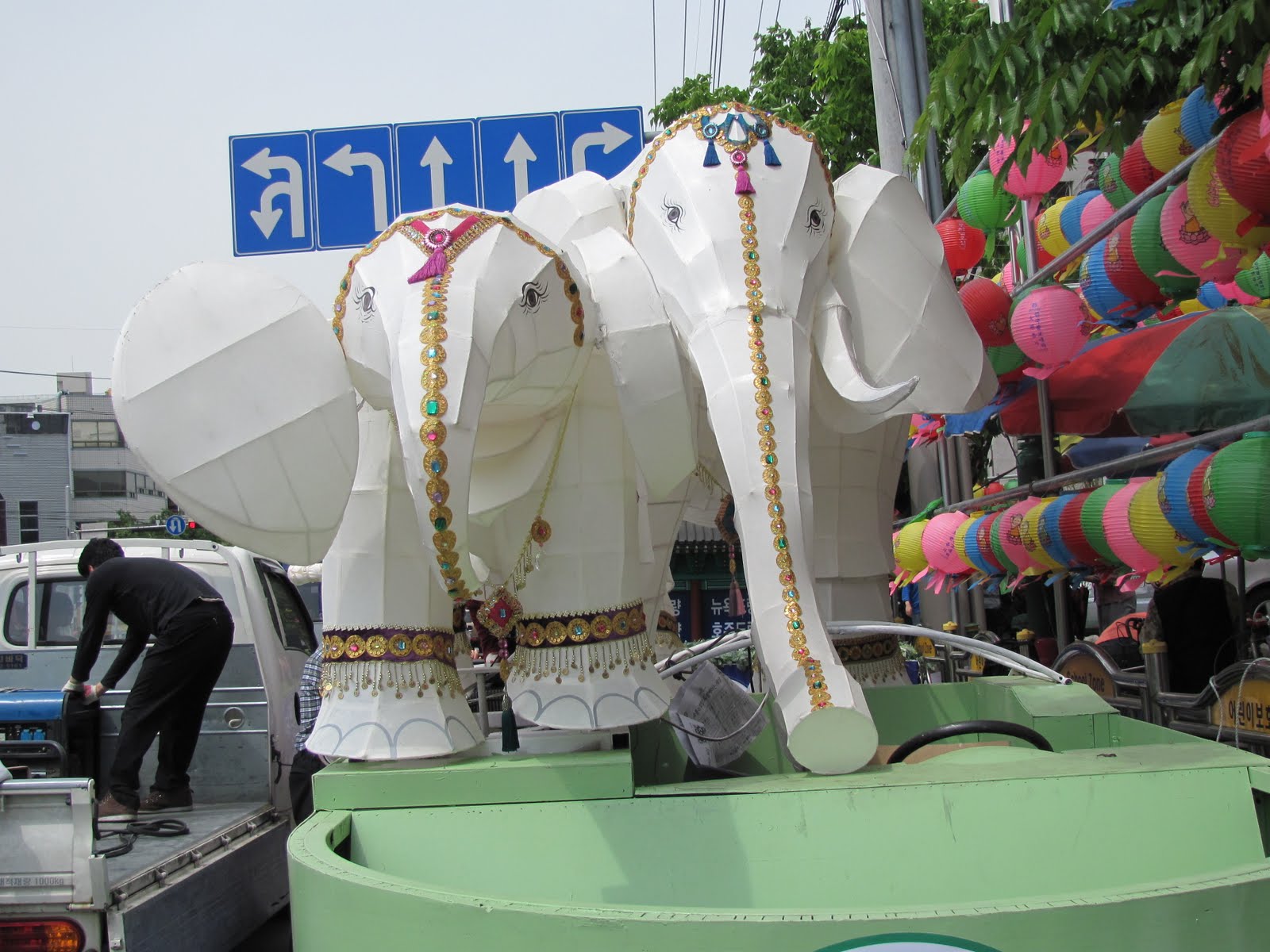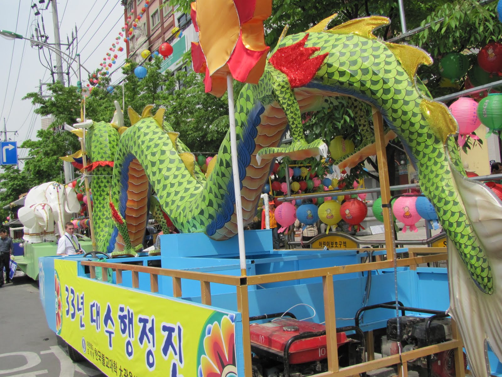Just before the float of the dragon was this float holding these beautiful bejeweled white elephants.