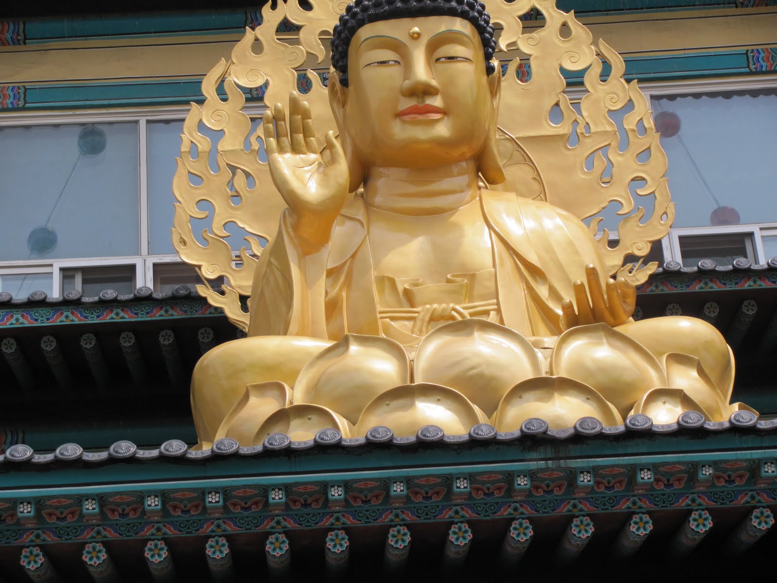 Well, nothing like starting a new blog with a picture of a Golden Idol..... The #1 religion in Korea is Buddhism and May is when they celebrate his birthday. Quite an event; parades, days of work off, evening celebrations as well as day events. They hang what I call Chinese/Japanese Lanterns all around any and all of the Buddhist's Temples in the area. It's very colorful and festive. This particular one is in front of one of the Buddhist Temples in Daegu.